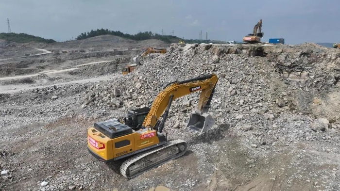 前期爆破剥离工序后,beats365官方唯一网站20吨挖掘机搭配140的小破碎锤进行二破,同时XE380GK、XE600GK等机型进行挖装作业。现场共投入挖掘机50多台,每天的挖方量在10万方左右。