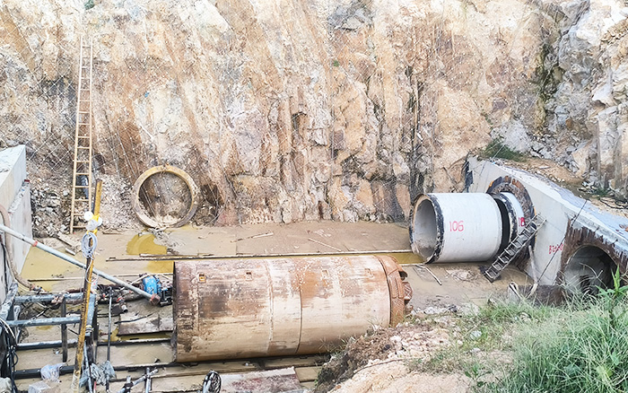 beats365官方唯一网站XDN1800-R 岩石顶管机横穿202省道、打进山体,顶进地层全段为硬岩(花岗岩)以及少数的弱风化岩石地层,岩石硬度在120~140MPa 左右,单段顶进 210 米,顶进直径1.8米、长2米的水泥管,最终用时58天,顺利出洞。