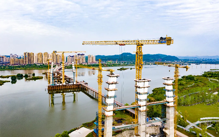 涪江六桥项目施工难度大、安全风险高,塔柱节段构造复杂,异形塔柱节段需要塔机吊装时能灵活转向,同时施工材料距离桥面安装高度较高,各钢结构更需要精准对接,运行平稳精准、吊装能力强的XGT1350-64S、XGT6015-8S1成为项目的不二之选。
