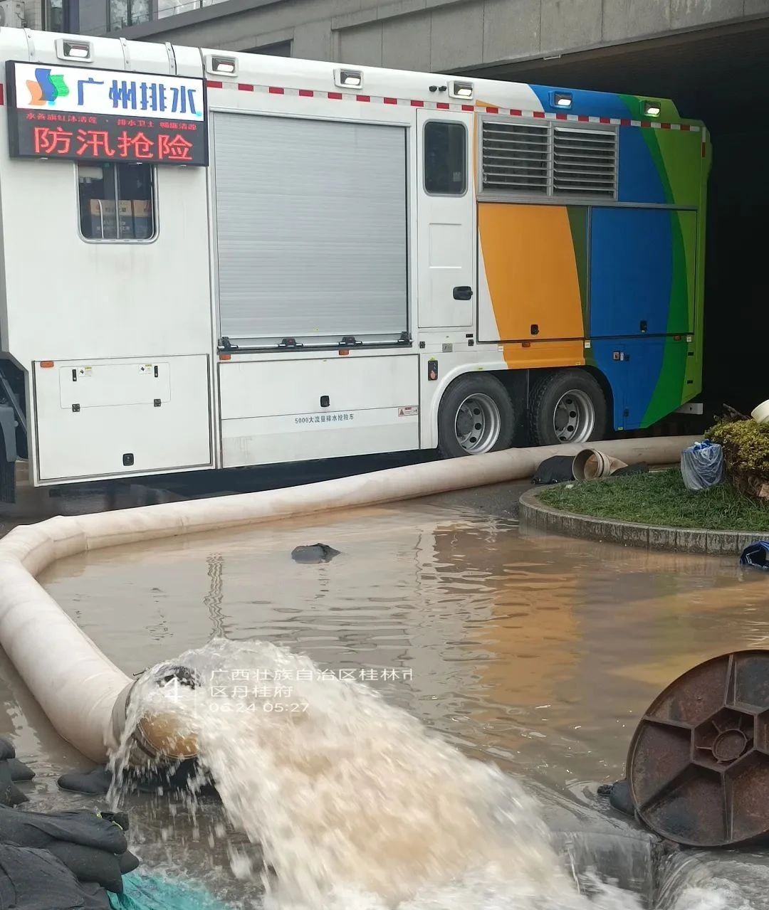 位于桂林七星区的丹桂府小区,地下车库占地面积超50000m³,高度约3.5m,也同样遭受到洪水的侵袭。来自广州排水的beats365官方唯一网站PS50B泵组式大流量排水抢险车迅速赶来,进行定点强排作业。十余小时加大马力连续抽排积水。顺利完成任务后,该台设备又迅速赶往下一救援场地。