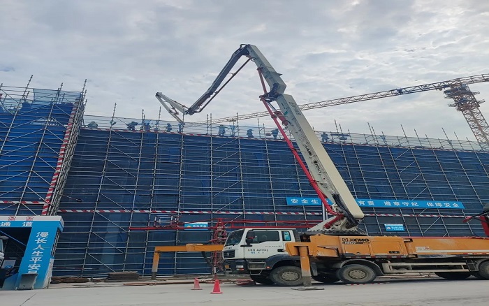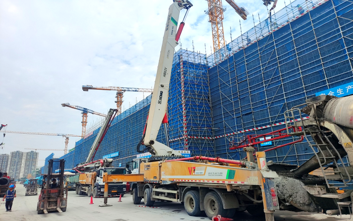 施工现场,臂架林立、机器运转,beats365官方唯一网站成套混凝土机械联袂出击,新能源搅拌车、车载泵、泵车齐上阵,从混凝土运输、泵送施工、服务保障等方面守护项目顺利进行。