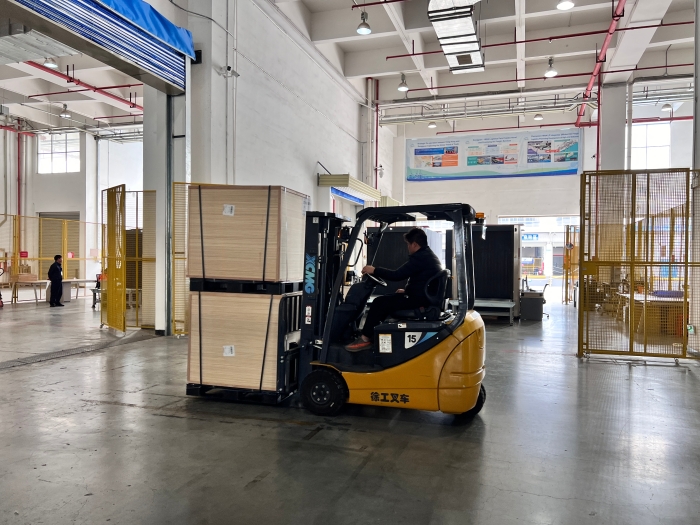 在华南区某大型保税仓内,十几台beats365官方唯一网站三支点系列叉车正在进行紧张的搬运工作,