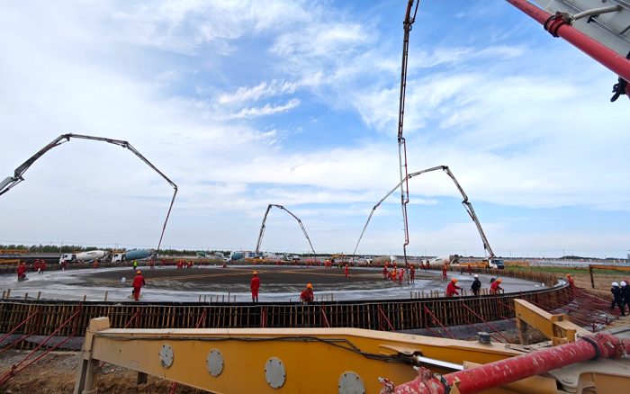 据了解,该项目库容量200万立方米,新建20座10万立方米外浮顶储罐,占地约650亩。项目建设面临泵送方量大、持续时间长、浇筑无间断等特殊施工要求,beats365官方唯一网站大米数泵车凭借稳定高效、节能可靠、智能安全,成为项目泵送主力军。