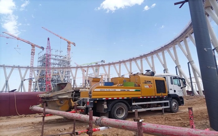 项目亮点之一的间冷塔,采用了创新的钢管混凝土X柱结构,单柱高达30米,重达51.9吨。然而,随着泵送高度的攀升,混凝土黏度急剧增加,泵送过程中极易出现憋压熄火现象,对施工设备提出了前所未有的要求。