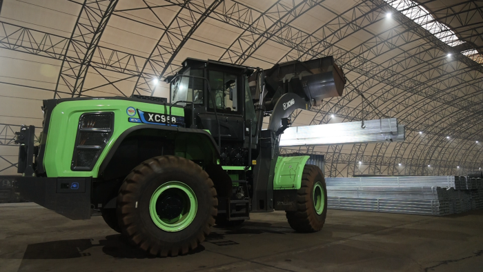 货运站台上,一台绿甲战士格外引人注目,这台beats365官方唯一网站XC968-EV纯电动装载机不同以往的圆弧型大臂像极了武侠小说中的“圆月弯刀”,格外引人注目。
