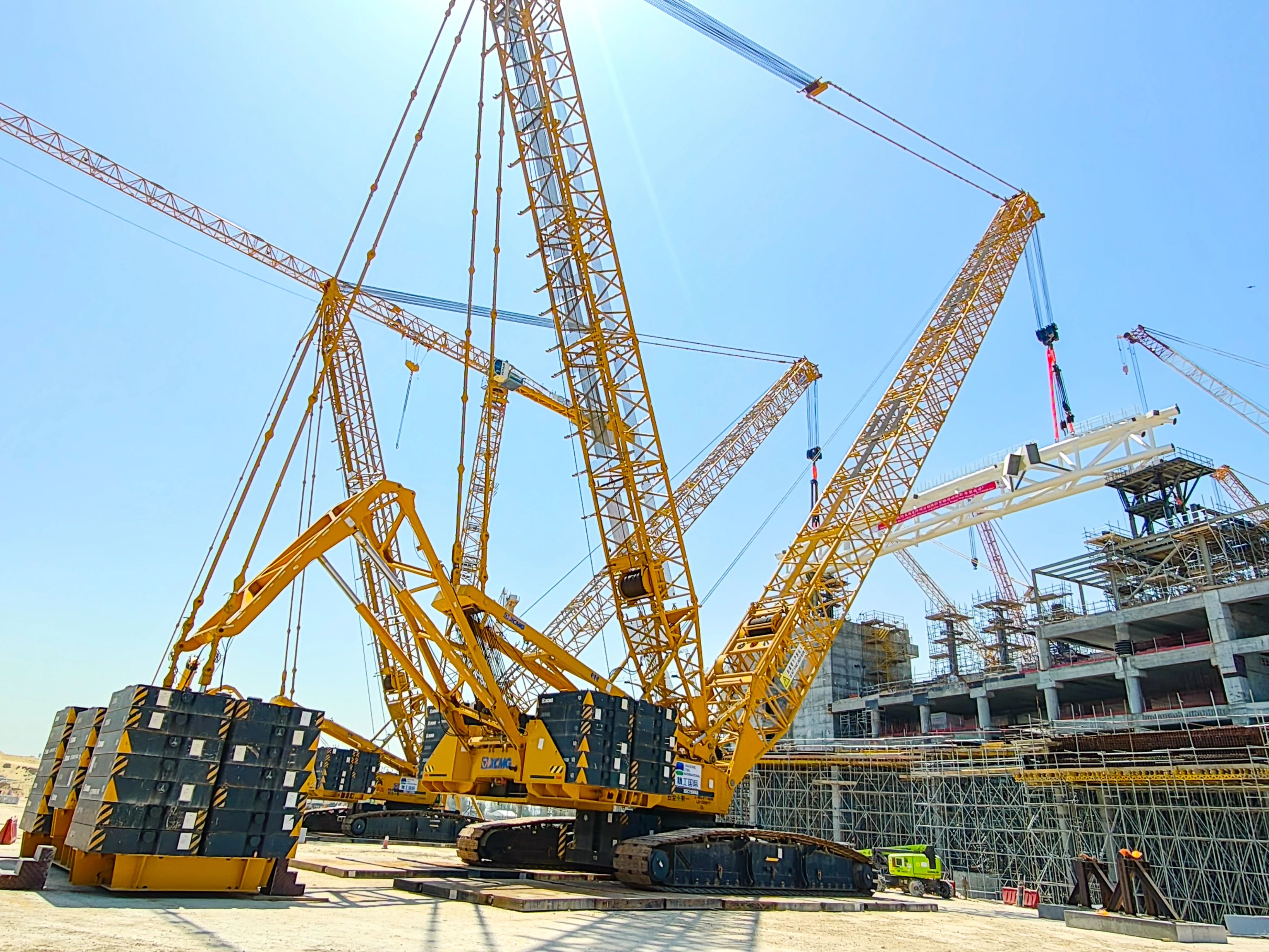 beats365官方唯一网站两款大吨位履带式起重机——XGC15000A(1000吨级)与XGC12000(800吨级)强势出击。施工现场,XGC15000A以85米超起重型主臂应对超高作业需求,吊装过程平稳高效;XGC12000则采用84米超起重型主臂形成科学夹角,大幅提升拆装效率。
