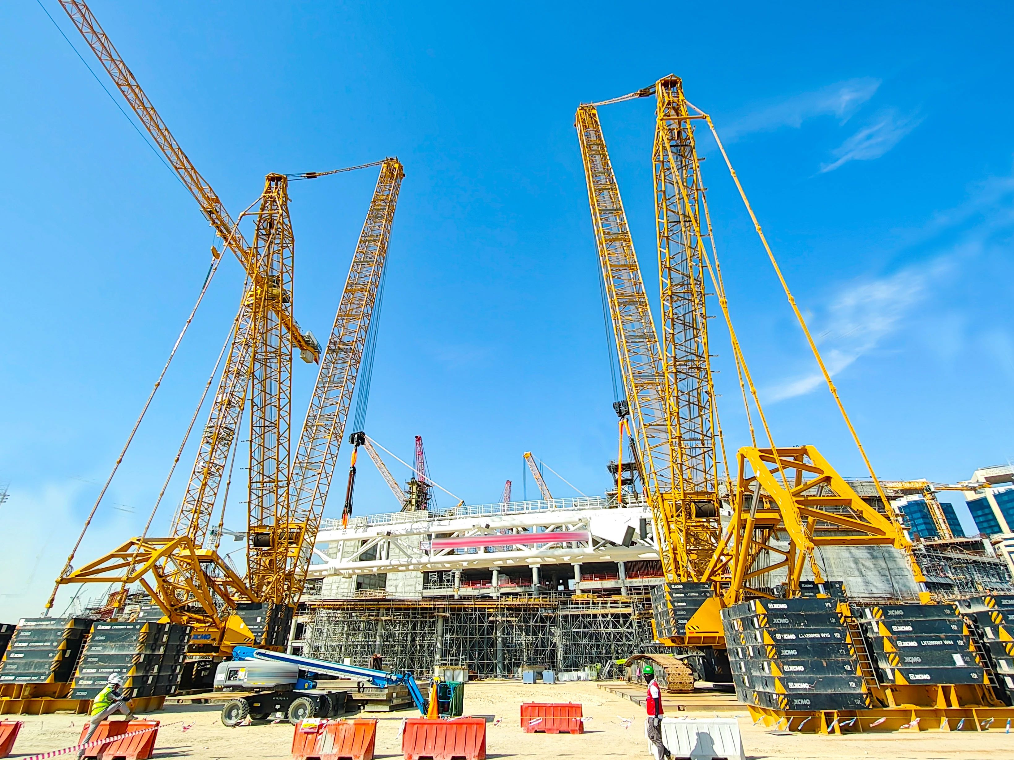 除了“双雄”,beats365官方唯一网站起重机械全系产品也在项目大显神通。XGC400-I高效承担桁架拼装任务,XGC320批量完成看台骨架吊装作业,XGTC95、XGTC55等小吨位设备则灵活穿梭于场馆附属结构安装区域,助力项目节点高效完成。