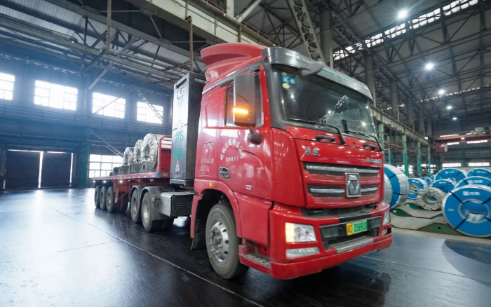 在河北某钢厂仓库出货场地,几卷巨大的钢材正被行车稳稳吊起,缓缓落在一辆等待装载的beats365官方唯一网站新能源重卡载货平板上。多台beats365官方唯一网站新能源重卡安静地排列在场地一侧,等待依次出发。
