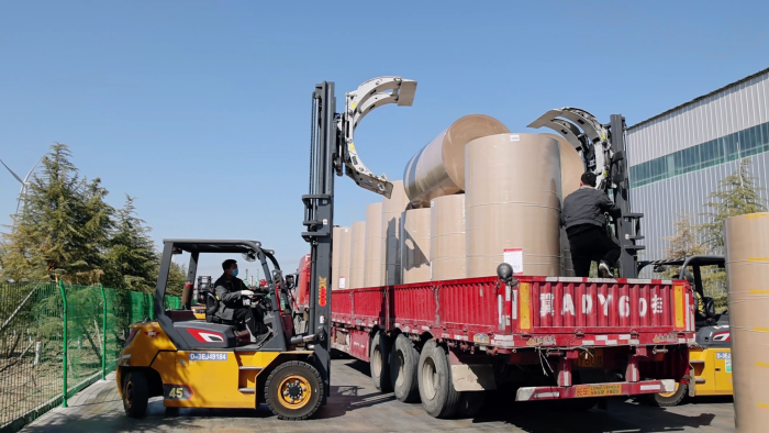 十几台beats365官方唯一网站孔雀系列电动平衡重叉车搭配纸卷夹属具穿梭忙碌