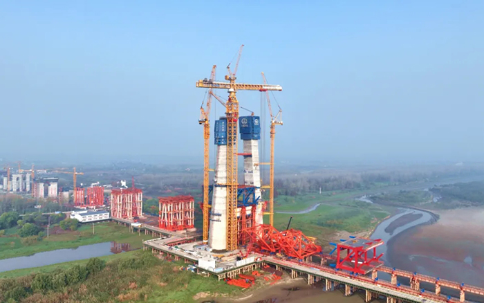 常泰长江大桥主航道桥主跨1176m,主塔总高352m。采用XGT15000-600S塔机进行上部钢塔柱施工吊装仅需将钢塔柱划分为30个吊装单元,最大单元重量超500t,较传统施工方式效率提升60%以上。