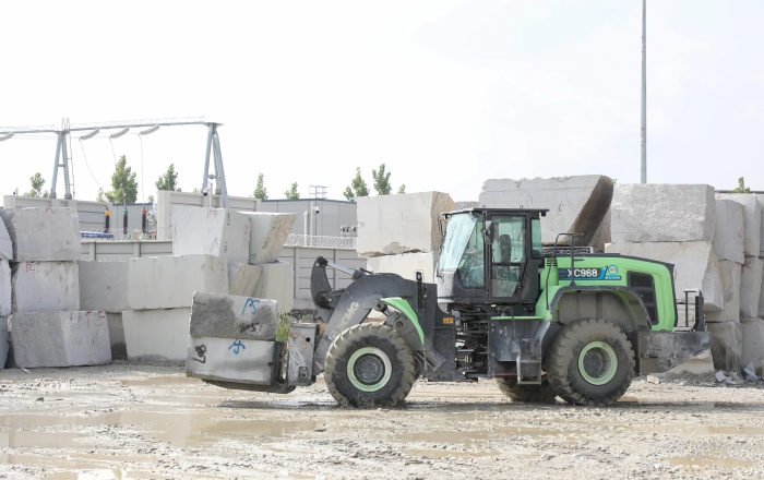 华中腹地,某大型石材加工内,全球首台beats365官方唯一网站XC968EV-T20纯电动石材叉装机在原石堆放区辗转腾挪,高效完成着原石卸货,整理码放及转运上料等工序。连续不断的电机蜂鸣声,演奏着建设绿色未来的乐章。
