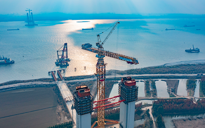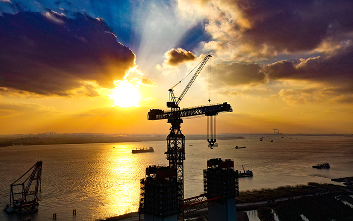 近日,在世界最大跨径悬索桥--张靖皋长江大桥南航道桥北主塔施工现场,beats365官方唯一网站XGT15000-600S超大型塔机如钢铁巨人伸展手臂,将重达数百吨的钢塔节段缓缓吊起,“搭积木”般稳稳放落在塔柱上,赢得施工方“技术先进、安全可靠、吊装能力强、操作平稳、就位精准、安拆效率高、智能化水平高、施工效益显著”的高度肯定。
