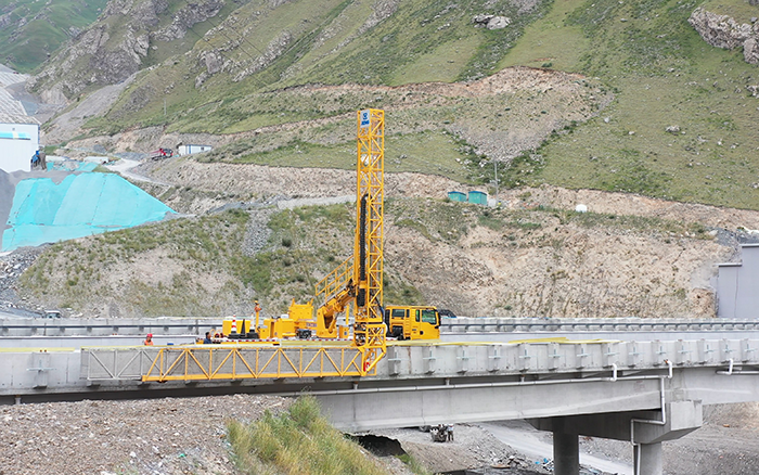beats365官方唯一网站桥梁检测车正稳稳托举数名工人及管材