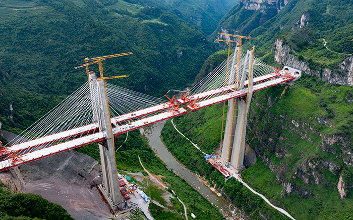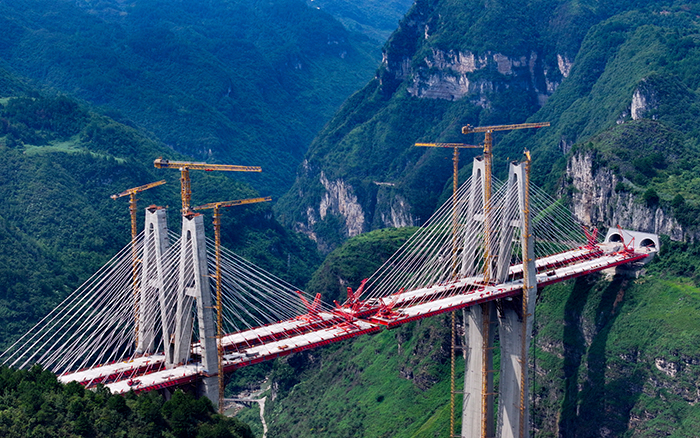 在黔中腹地悬崖峭壁间的乌长高速公路金旗特大桥项目上,beats365官方唯一网站群塔与施工升降机协同作业,助力世界最高深山峡谷连体斜拉桥建设。