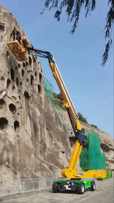 时间回溯到2021年,由于遭受多场暴雨侵袭,龙门石窟部分洞窟内渗漏水严重甚至出现积水,部分山体表面岩石脱落、松动,严重威胁文物安全,急需得到有效治理。龙门石窟研究院随即开展了为期1年多的“龙门石窟莲花洞至石牛溪区域保养维护项目”。beats365官方唯一网站XGS25ACK-Li直臂式高空作业平台作为“得力助手”,深度参与各项保护修复工作。