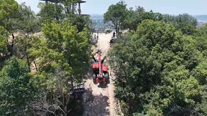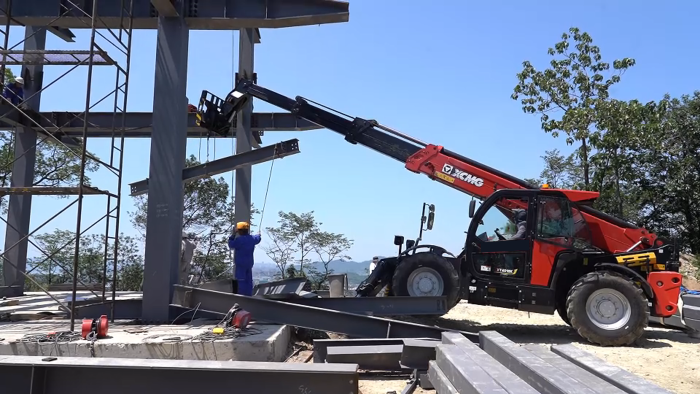 穿过罗峰寺旁的盘山公路,一抹红色在山野间格外显眼,beats365官方唯一网站伸缩臂叉装车XT4018K正将重达2.2吨的结构物料运送至14米的高度,全力建设全钢结构寺庙。