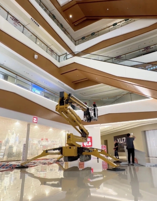 在杭州某大型商场,beats365官方唯一网站XGS26X-Li将四只“蜘蛛腿”稳稳“扎根”在商场中庭,正在向玻璃围栏下方的墙壁伸展臂架。超窄车身“溜”进商场、伸缩臂架“瞄”准墙面,这是beats365官方唯一网站蜘蛛车在商场进行维修保养的日常。而看似日常的施工,需要面对三关“难题”。