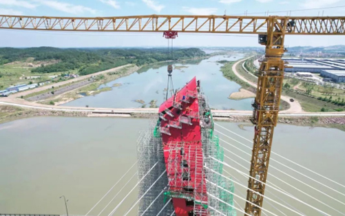 在大别山腹地、金寨县史河河畔,“红色摇篮”傲视远方,beats365官方唯一网站XGT2230-100S塔机挥舞着巨臂,随着重达40吨的主桥钢塔柱最后一个节段起吊安装到位,金寨史河大桥主塔顺利合龙。