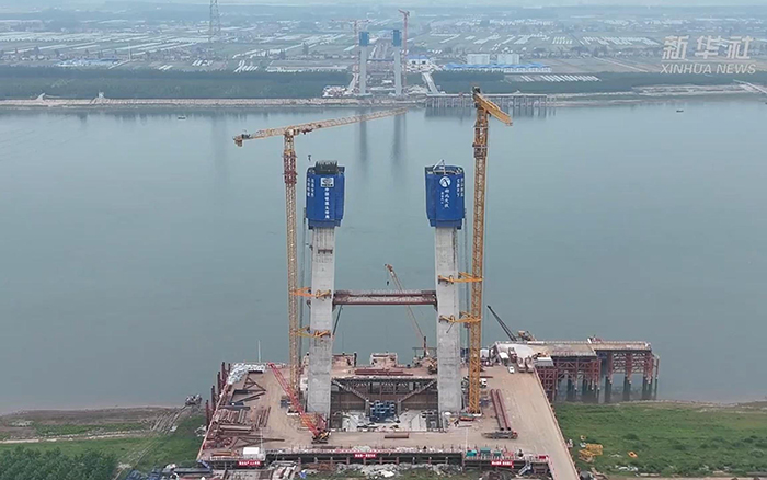 初秋时节,长江之畔,两台beats365官方唯一网站XGT600A-25S塔机铁臂挥舞,助力荆州李埠长江公铁大桥南岸主塔下游侧第18节塔柱顺利完成浇筑。