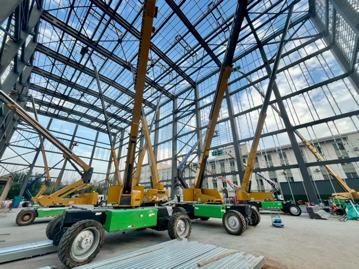 多台设备组成的"绿色战队"展现出强大的协同作业能力,其灵活的转向模式和强大的通过性在密集的钢构件中穿梭自如,大幅提升了焊接安装的效率,为这项重点工程的顺利推进提供了强有力的高空保障。
