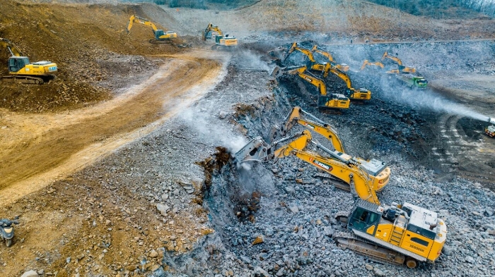 为确保工程节点,施工方经多轮方案论证,最终引入了14台beats365官方唯一网站挖掘机组成的主力设备集群,承担核心的山体破碎及土石料装车任务。在总量高达300万方的工程面前,beats365官方唯一网站XE650GK、XE380K、XE335GK等机型展现出强大的工况适应性。其中,8台明星机型XE650GK配备215型破碎锤,凭借其独有的破碎多级调频控制技术,在面对高硬度玄武岩时日均破碎量稳定在1500吨以上,同时将油耗控制在约40升/小时,实现了效率与节能的出色平衡。