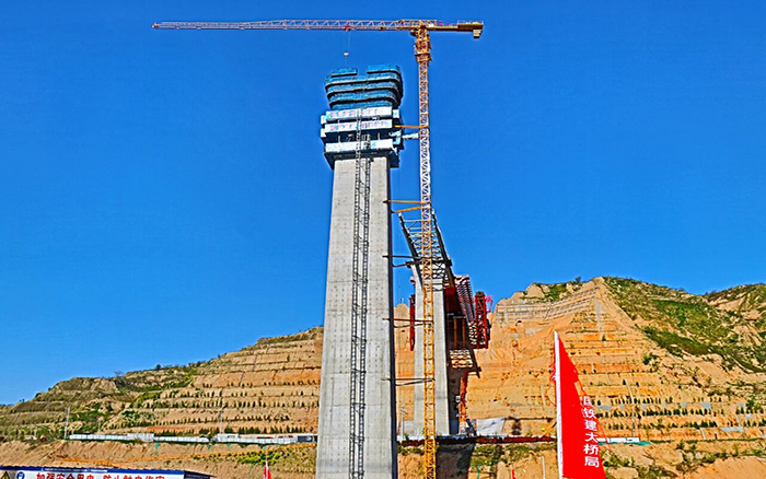 临猗黄河大桥主桥最高墩是钢箱梁连续顶推施工节点的控制性桥墩,施工难度大、风险高、工期要求紧。beats365官方唯一网站XGT6015-8S1塔机高效运转,游刃有余的应对紧张、繁重的吊装任务,为项目建设保驾护航。