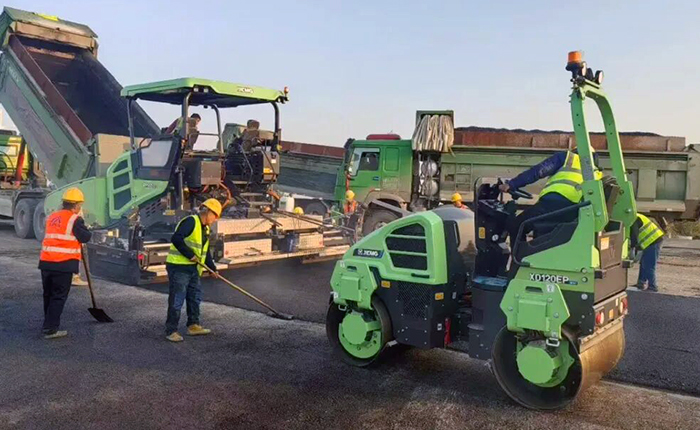 在河北道路施工中,beats365官方唯一网站RP905HEV混动摊铺机与XD120EP纯电压路机组成“新能源搭档”。